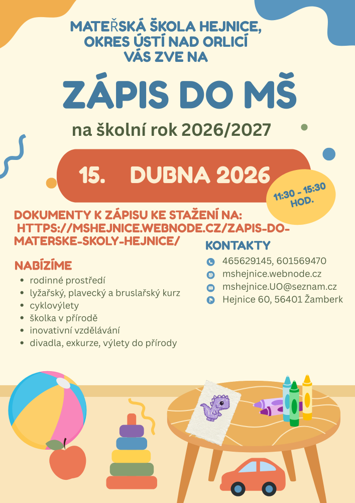 zápis dětí do Mateřské školy Hejnice se uskuteční dne 15. 4. 2026 od 11.30 do 15.30 hodin.